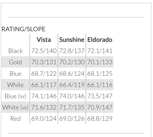 The course consists of three individual regulation 9-hole courses-Eldorado, Vista and Sunshine.