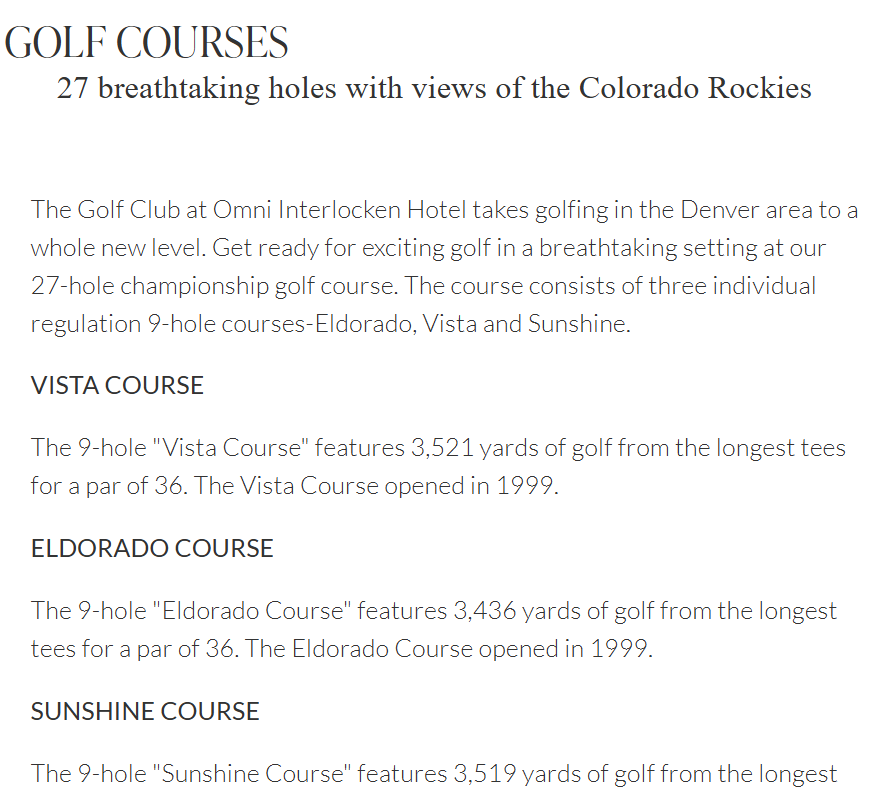 Forge a new path at our world-class golf courses near Denver and Boulder. The Golf Club at Omni Interlocken Hotel takes golfing to a whole new level. Get ready for exciting championship golf in the Rockies at our 27-hole championship golf course in Broomfield, Colorado with striking scenery and more than 400 feet of elevation changes. The golf course consists of three individual regulation nine-hole courses – Eldorado, Vista and Sunshine.